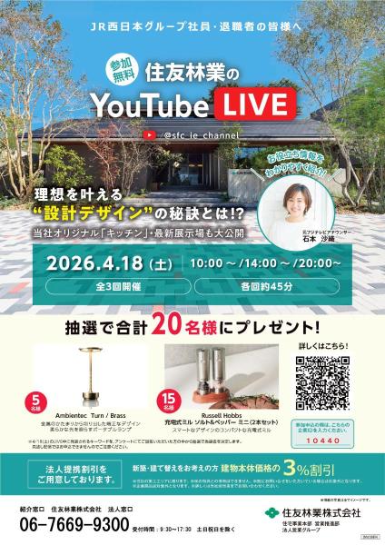 近畿地方北海道地方東北地方関東地方中部地方中国地方四国地方九州地方【住友林業】★参加無料★住友林業のYouTubeライブ2026.04.18開催セミナー近畿地方北海道地方東北地方関東地方中部地方中国地方四国地方九州地方【三井ホーム】特別優待キャンペーン2026.04.01〜05.31開催キャンペーン近畿地方北海道地方東北地方関東地方中部地方中国地方四国地方九州地方【積水ハウス】北近畿エリア 4月イベント情報2026.03.23〜04.30開催住宅フェア・相談会近畿地方北海道地方東北地方関東地方中部地方中国地方四国地方九州地方【パナソニックホームズ】今のうちに考えておきたい!『相続対策セミナー』(inホテルモントレラ・スール大阪)2026.04.25開催セミナー近畿地方北海道地方東北地方関東地方中部地方中国地方四国地方九州地方【三井ホーム】石川県かほく市 構造見学会2026.04.05開催見学会近畿地方北海道地方東北地方関東地方中部地方中国地方四国地方九州地方【三井ホーム】金沢市石引 完成見学会2026.04.01〜06.30開催見学会近畿地方北海道地方東北地方関東地方中部地方中国地方四国地方九州地方【イムラ】資産形成と住まいづくりセミナー2026.04.12開催セミナー近畿地方北海道地方東北地方関東地方中部地方中国地方四国地方九州地方【アーキホームライフ】4/4~ 箕面市小野原東 見学会開催!2026.04.04〜04.05開催見学会近畿地方北海道地方東北地方関東地方中部地方中国地方四国地方九州地方【一条工務店】山口県内限定 ご来場特典2026.03.01〜07.31開催キャンペーン近畿地方北海道地方東北地方関東地方中部地方中国地方四国地方九州地方【イムラ】マンションリノベーション モデルルーム グランドオープン2026.03.20開催その他近畿地方北海道地方東北地方関東地方中部地方中国地方四国地方九州地方【JR西日本住宅相談室】住宅相談室ニュース 金沢版 4月号その他近畿地方北海道地方東北地方関東地方中部地方中国地方四国地方九州地方【JR西日本住宅相談室】アーバン地区マンション物件のご紹介その他
