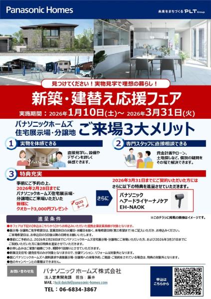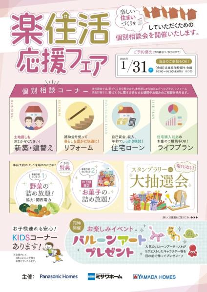 富山県石川県福井県三重県滋賀県京都府大阪府兵庫県奈良県和歌山県鳥取県島根県岡山県広島県山口県福岡県佐賀県長崎県熊本県大分県【パナソニックホームズ】1月31日(土)開催 楽住活応援フェア2026.01.31開催住宅フェア・相談会富山県石川県福井県三重県滋賀県京都府大阪府兵庫県奈良県和歌山県鳥取県島根県岡山県広島県山口県福岡県佐賀県長崎県熊本県大分県【パナソニックホームズ】新築・建替え応援フェア2026.01.10〜03.31開催キャンペーン福岡県佐賀県長崎県大分県【スウェーデンハウス】冬のモデルハウスご来場キャンペーン♪2026.01.03〜01.31開催住宅フェア・相談会